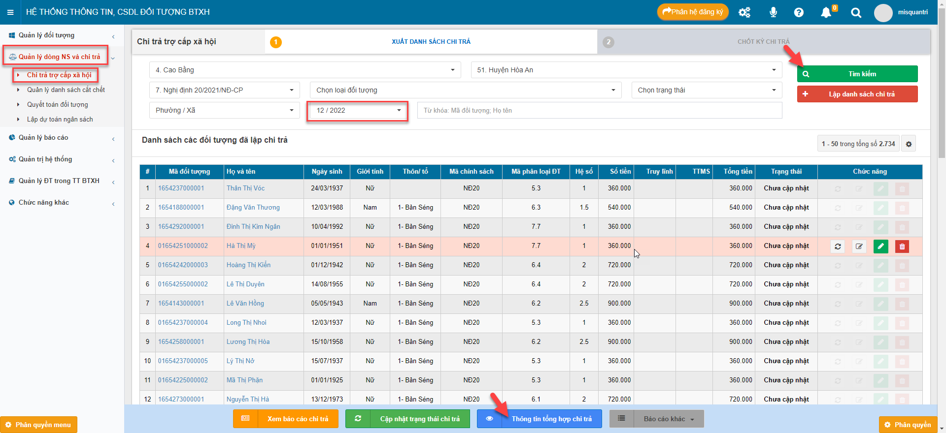 **Thông tin trong danh sách chi trả không được tự động cập nhật, vì vậy sau khi chỉnh sửa thông tin cho đối tượng, anh/chị cần phải cập nhật lại danh sách chi trả theo các cách sau:**