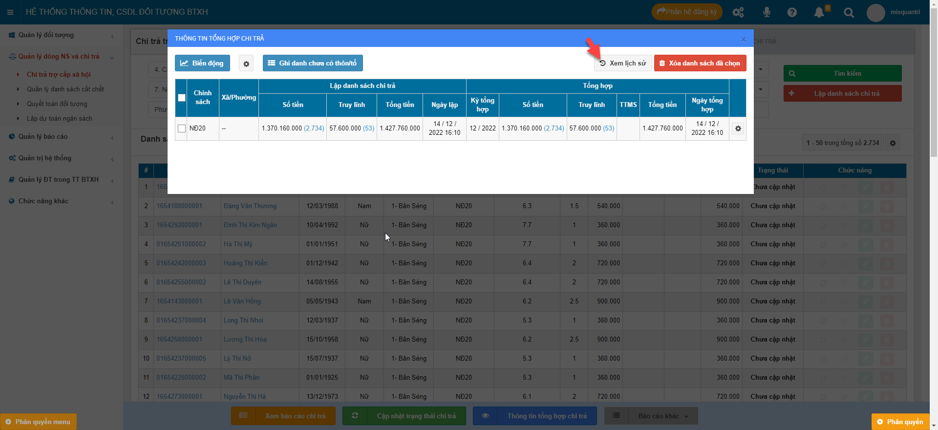Cửa sổ Thông tin tổng hợp chi trả mở ra, anh/chị vào Xem lịch sử để kiểm tra ngày lập DS chi trả đúng của kỳ đó&#x20;