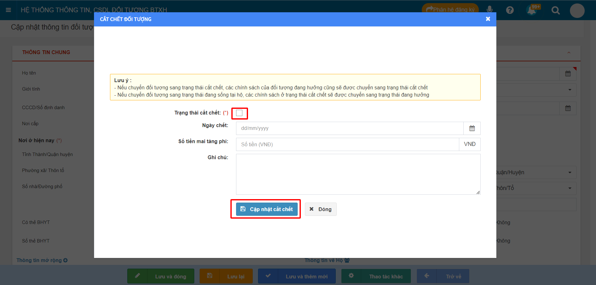 **Bước 4:** Tại màn hình cập nhật thông tin đối tượng này, anh/chị chọn Thao tác khác => **Cắt chết.**