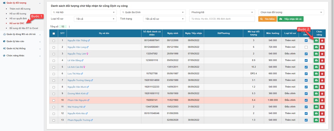 Cán bộ cấp Quận/Huyện thực hiện tiếp nhận dữ liệu từ cổng dịch vụ công vào phân hệ quản lý thông tin, CSDL đối tượng BTXH